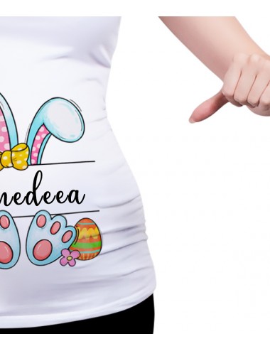 Cauti ceva de purtat la masa in familie? Ia-ti un tricou haios de gravide cu iepuras si cu numele lui bebe!